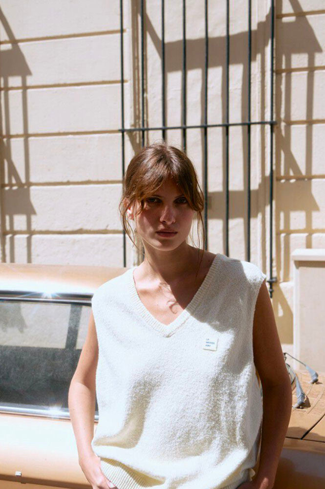 V-neck sleeveless knit sweater in a soft and gentle pearl melange colour-way. Wear as a lightweight and cosy layer, or by itself as a top.
