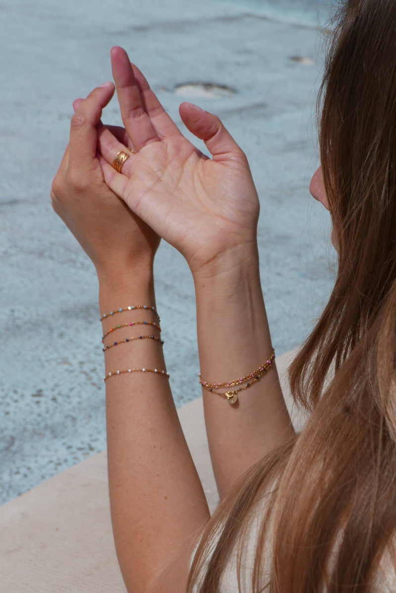 The Castelo bracelet is a fine gold color chain with sunlight-colored beads, clasped with a small pastille. Wear it all summer long without any hesitations, a luminous touch for the beach.