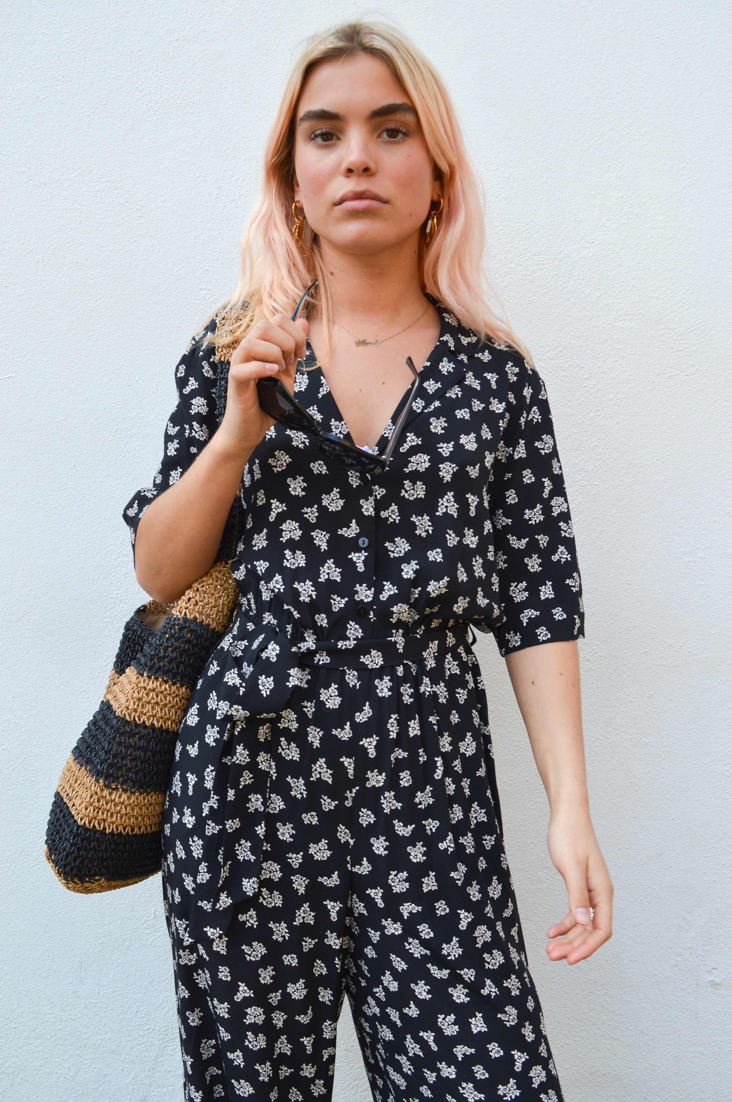 Experience luxury with Des Petits Hauts' Romilia Lily Jumpsuit. Its delicate v-neck and floral pattern add sophistication to your wardrobe in a boho chic style. Flattering short sleeves add elegance, making this jumpsuit a must-have.