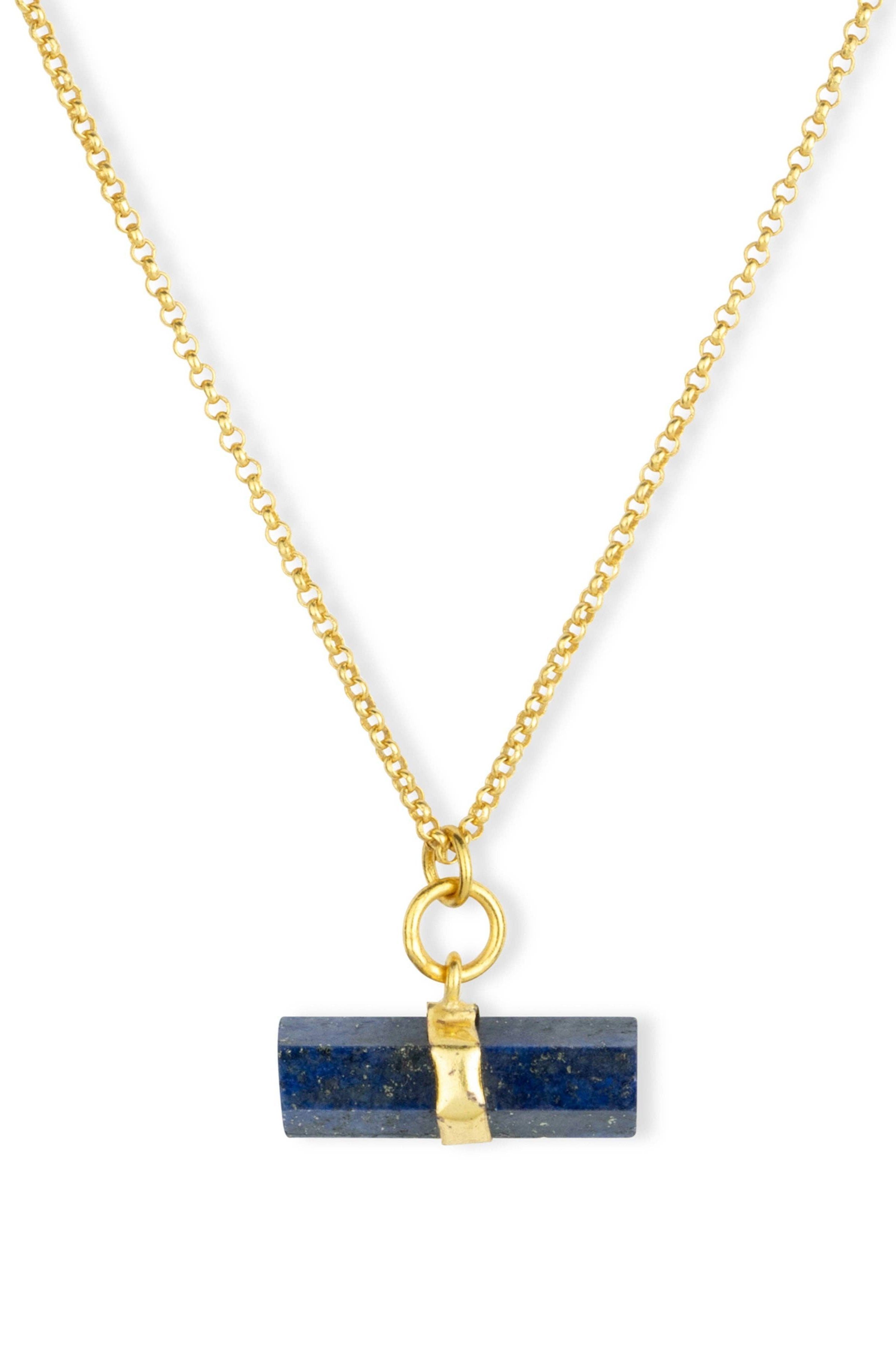 The Ditta necklace features a hexagonal cut gemstone bar, held by a brushed gold loop. This delicate and minimalist pendant necklace lets the semi precious stone be the star of the show. Pairs well with short gold layering necklaces for a contemporary necklace stack.