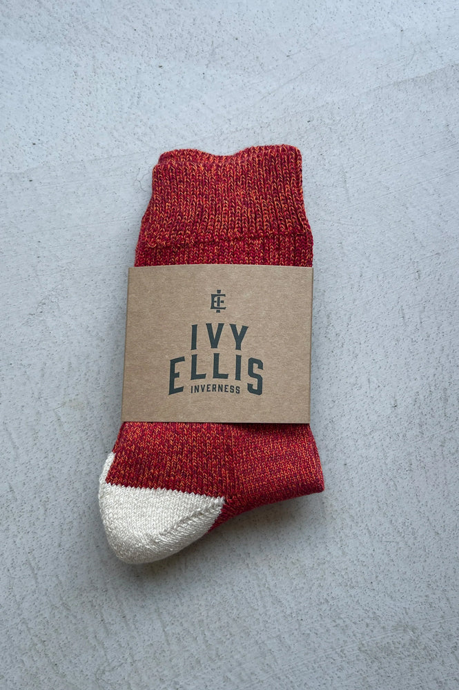 Inspired by the daring climbs of 70s and 80s California, The Sunnyside socks from Ivy Ellis reflect the vibrant yet simple attire of rock climbers in Yosemite. Each sock is crafted using three different color yarns, intertwined simultaneously, ensuring no two pairs are the same. The rich red base is complemented by a cream heel and toe, combining style and durability in one unique design.