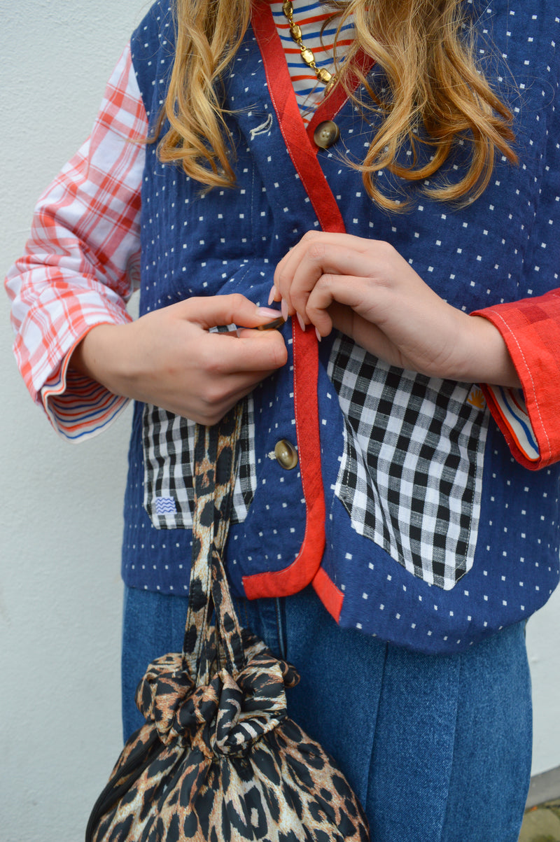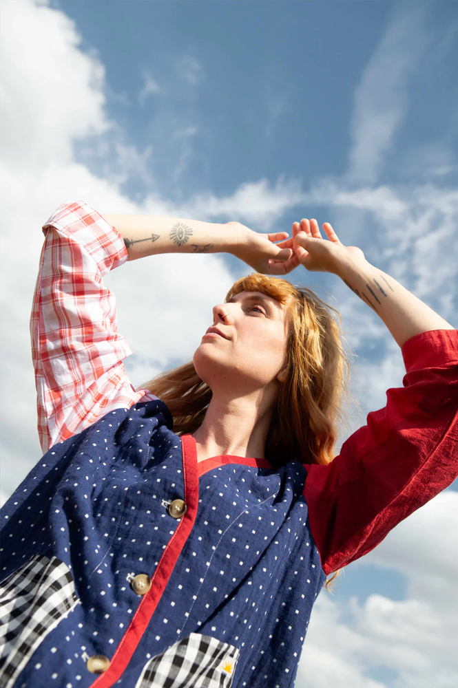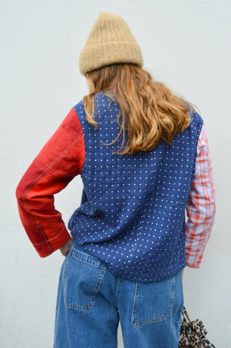 Straight cut jacket with a low v-neckline fastened with tortoiseshell buttons down the front. Crafted from a playful patchwork of various textural check and gingham fabrics, with front patch pockets adorned with our mini sun and wave woven patch logos.
